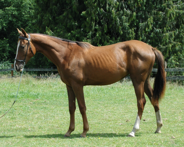 هذا جين متنحي، لذا يجب أن يحمل الحصان نسختين من “e” (واحدة من كل والد) ليظهر اللون الأحمر. يوجد العديد من درجات اللون الكستنائي (الأحمر)، التي تتراوح من “الكستنائي الكبدي” الداكن إلى “الكستنائي المشمشي” الفاتح.
